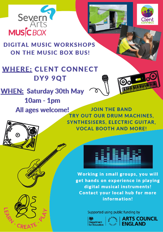 MARK YOUR DIARIES! On Saturday 30th May, we are delighted to welcome the Severn Arts Music Box Bus to the Hub, from 10am to 1pm – and everyone is invited to come along and get involved!